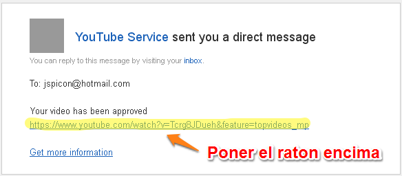 Si os fijáis parece un mensaje inocente en el que Youtube me comunica que han aprobado un vídeo mío. Incluye mi propia dirección de correo y un enlace que aparenta ser el enlace a un vídeo incluso con HTTPS:// que parece ser una conexión segura.