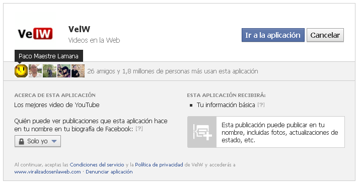 Ya estamos con los forzamientos. Leed bien lo que pone. 28 amigos míos han instalado la aplicación mas 1,8 millones de personas han caído en la red. Primera pregunta: Si son vídeos de YOUTUBE… ¿Porque tengo que darle a nadie (que no conocemos de nada) mis datos? Y encima le damos permiso para que publique en nuestro nombre, de ahí las notificaciones de origen desconocido para muchos.